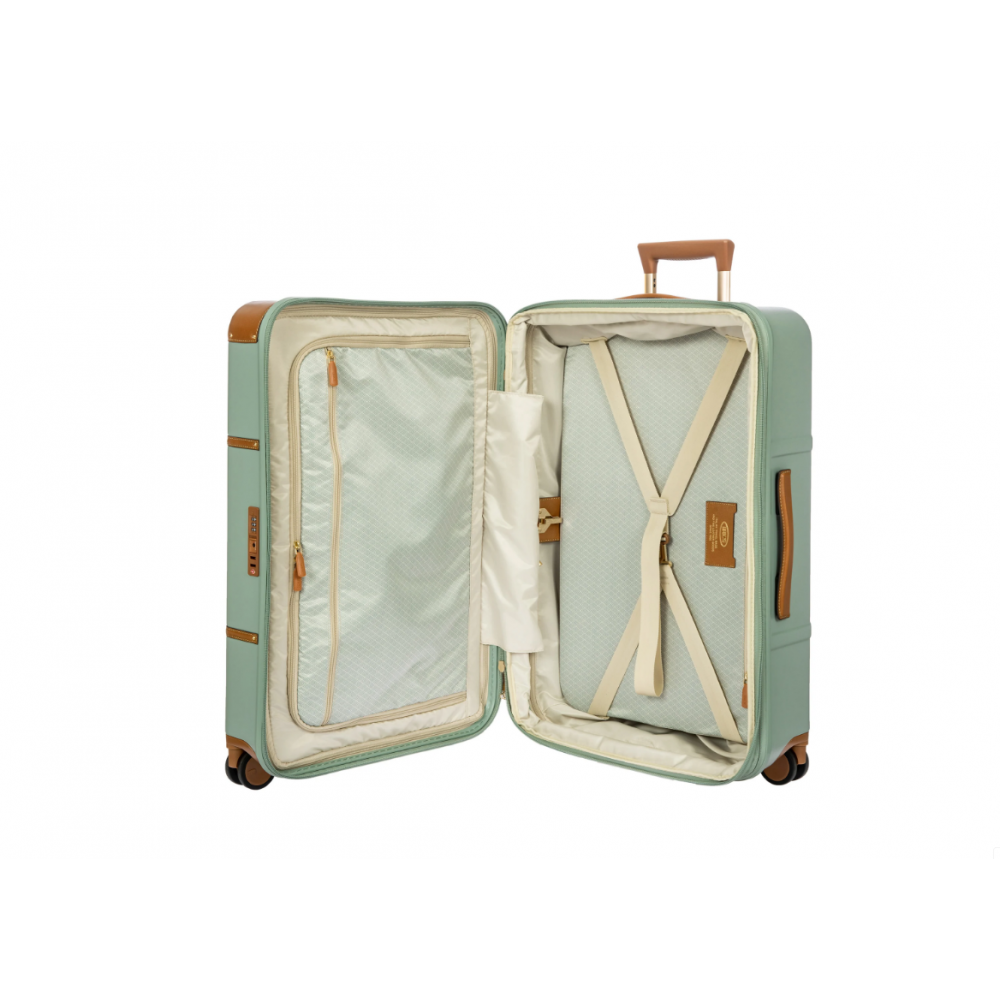 Колекція Bellagio характеризується безпомилковим дизайном, нашою найвідомішою. Цей візок середнього розміру виготовлено з переробленого полікарбонату, легкого, гнучкого матеріалу, надміцного та ударостійкого. Застібка оснащена замком TSA та надзвичайно надійною блискавкою: ця система захисту від злому забезпечує оптимізований рівень захисту від спроб крадіжки. Внутрішня частина оснащена системою стиснення, розділеною на два відділення для забезпечення ефективної організації всіх ваших речей. Крім того, розширювана блискавка дозволяє збільшити його місткість. Підкладка легко знімається завдяки спеціальній блискавці: таким чином, якщо потрібно, її можна випрати окремо. Для забезпечення зручності та простоти використання висувна ручка складається з надійних, міцних алюмінієвих трубок із проміжними положеннями упору, щоб її висоту можна було регулювати за потреби, і ергономічною ручкою. Чотири подвійні колеса тихо рухаються та обертаються на 360° для гарантованої маневреності, оснащені кульковими підшипниками, які забезпечують плавність руху. Крім того, колеса втоплені в корпус, що збільшує місткість візка. Зовнішня частина візка Bellagio оздоблена характерними елементами зі натуральної шкіри Bric, доповненими вишуканими деталями логотипу. Шкіряний носій адресної бирки є важливим завершальним штрихом. Щоб краще організувати валізу, набір вішалок і сумку для одягу з тканини можна придбати окремо. Прозорий чохол на валізу,йде в комплекті.